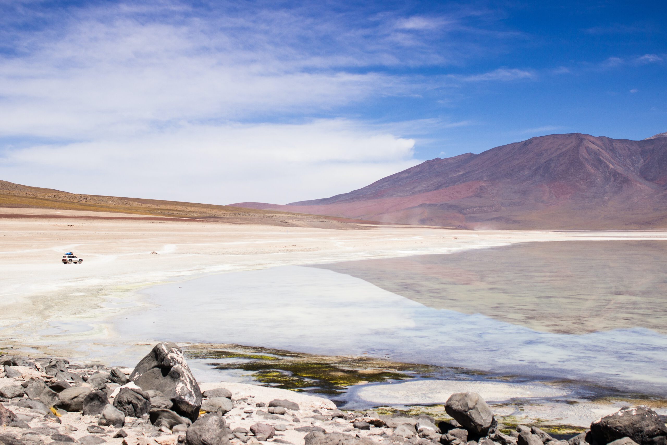 1. Tag: Nach der Übernachtung im Hotel del Desierto auf 4.530m fahren wir am nächsten Tag vorbei an den Flamingo-Lagunen Ramaditas, Honda, Chiarkhota, Hedionda und Cañapa, über den Salar de Chiguana und durch das Ejercito de Piedra (bizarre Lavaformationen) nach San Pedro de Quemés. Überall, wo es uns gefällt, steigen wir aus unserem Land Cruiser aus und genießen die faszinierenden Wüsten-, Lagunen- und Vulkanlandschaften zu Fuß. Und natürlich fotografieren wir Flamingos.